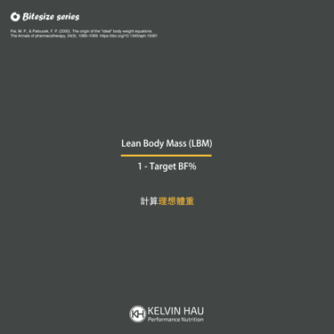 • 計算自己的理想體重(Ideal body weight), 透過量度體脂率(BF%), 便可以計算出自己理想的體重。留意不能低過必需體脂率(Essential Fat),男性為2-5%,女性為10-13%